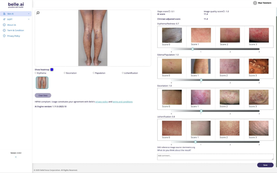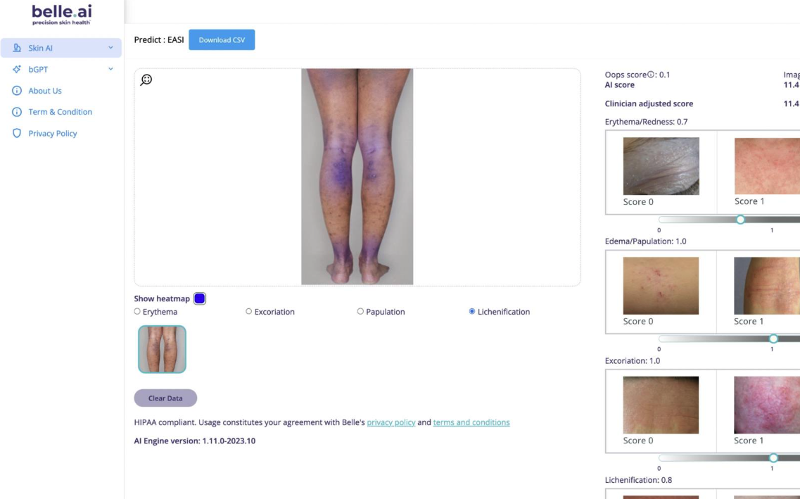 - Erythema/Redness, Edema/Papulation, Excoriation, and Lichenification are graded on a scale from 0 to 3. You may click on their respective circles to visualize the AI-generated heatmap for each of these conditions that was used to calculate those 4 gradings.